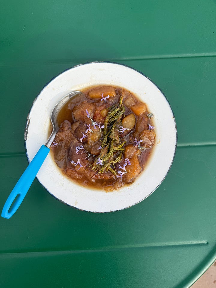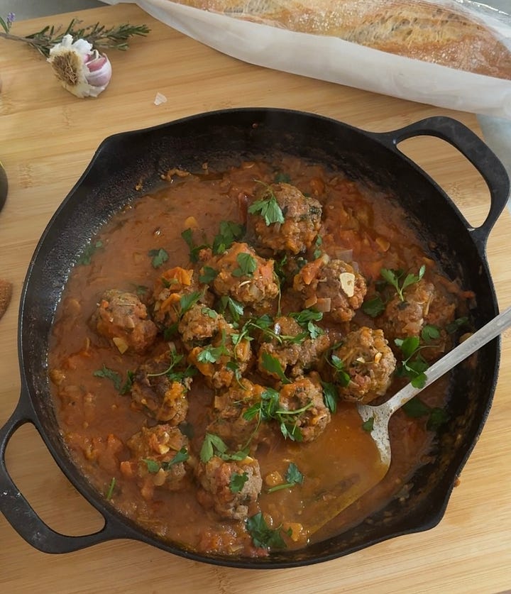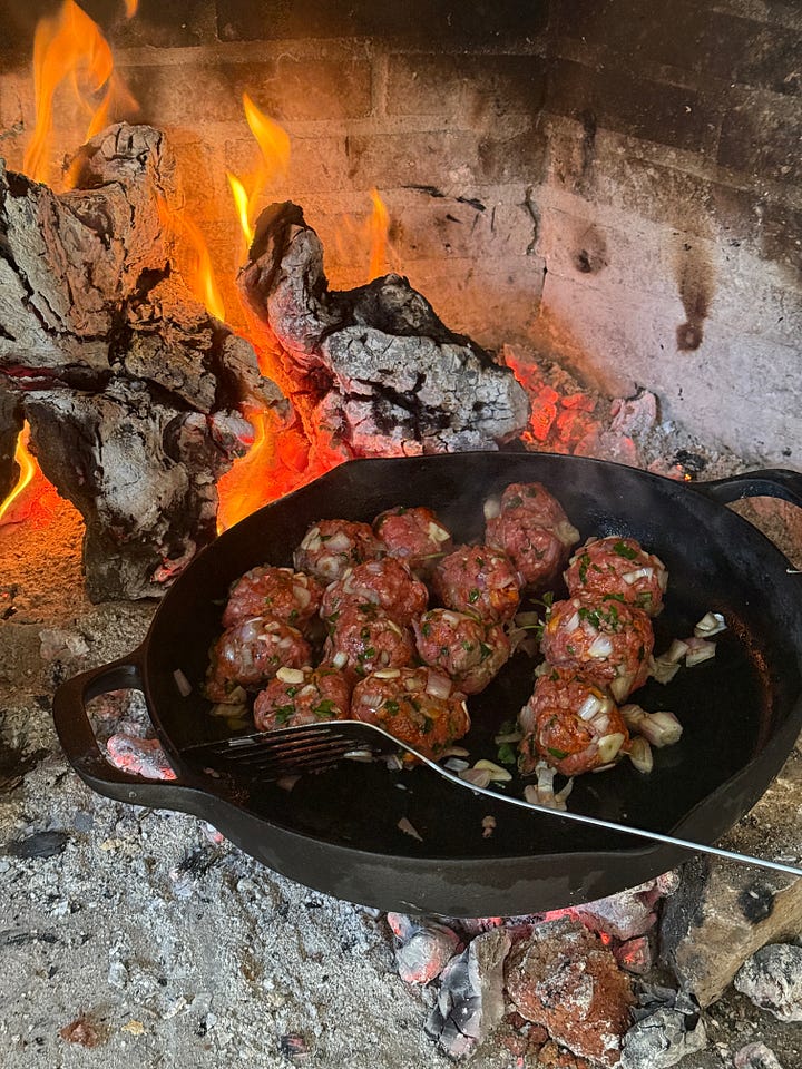 Recapping the last month, I can see just how much has been accomplished in such a short period of time. We've made a plan for olive tree maintenance. We've purchased a refrigerator. We've picked up several finds from the FB marketplace to begin making the empty space feel slightly more like a home. We watched a Calla Lily in the front courtyard bloom and the Narcissus I picked up at Ikea open its laughy little yellow daffodil flowers. We've indulged in quite a few tasty restaurants and even more meals cooked by fire— roasted pears with local cheese, fried eggs and potatoes, blistered peppers, charred eggplant, caramelized sweet potato, slow roasted beef and chorizo meatballs (recipe below), melted cabbage, creamy risotto, pot after pot of savory soup drizzled with the finest, freshest olive oil eaten alongside salads made up of the wondrous local produce available here even in winter.