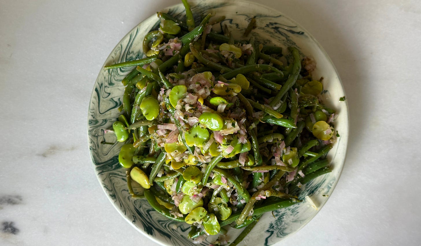 Begin by setting a large pot of water on the stove to boil over high heat. While the water heats, trim the stemmed ends of the green beans and remove the fava beans from their pods. Once the water is boiling, first add the green beans, which take slightly longer to cook. After roughly 2 minutes, add the fava beans. Continue cooking for 5 or so more minutes, until the green beans are just beginning to become tender when tested. Drain the green beans and the favas, then immediately plunge them into a bowl of ice water to halt the cooking process and preserve the bright green color of the vegetables.